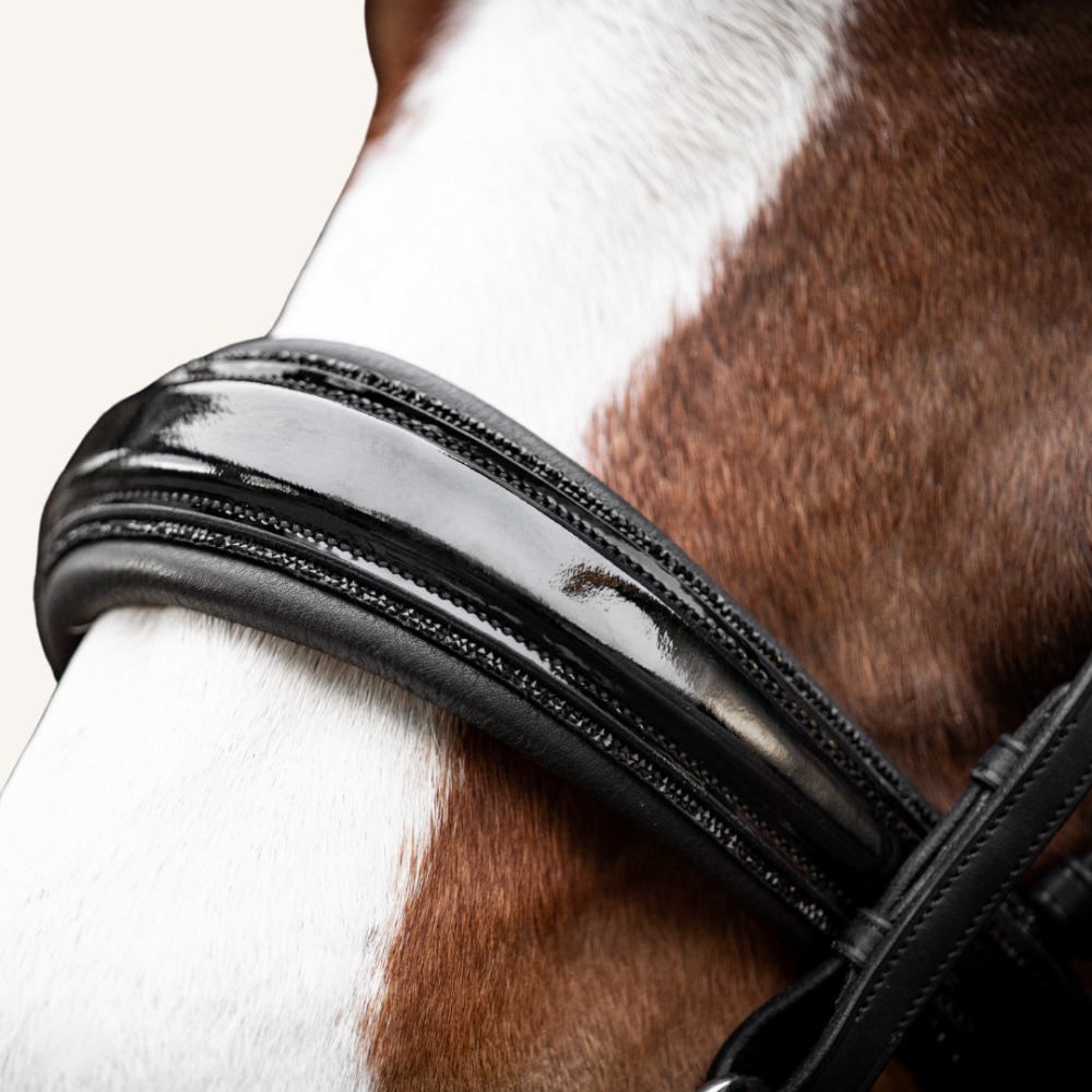 Unsere Kandare "Black Edition" ist ein absolutes Must-Have für alle, die schwarz genauso lieben wie wir. Die Kandare besticht durch ihr ganz und gar schwarzes Design: eine schwarze Glitzerbiese am Lack-Nasenriemen, der schwarz gefasste Stirnriemen mit extra großen schwarzen Kristallen und die schwarzen Beschläge des Zaums - eine absolute Besonderheit.