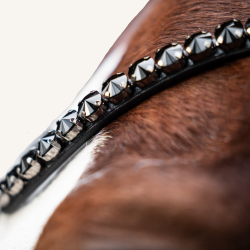 Der Stirnriemen an dieser Kandare ist ein sehr brillanter und auffälliger Stirnriemen mit extra großen Steinen in der Farbe Jet. Er wird mit wunderschönen glitzernden 10 mm Rivoli Kristallen gefertigt.