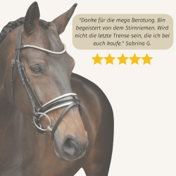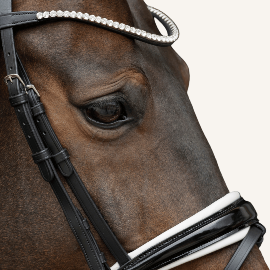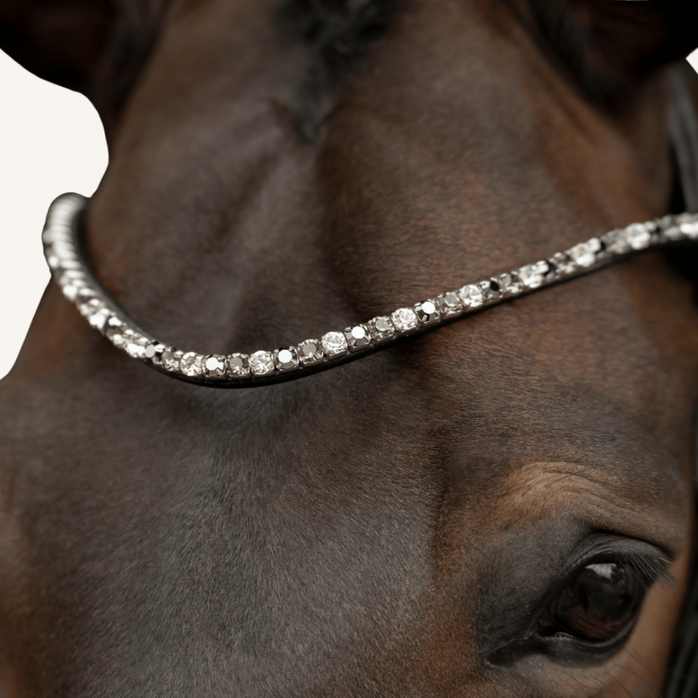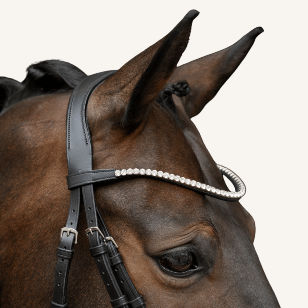 Als besonderer Blickfang tritt der Extra-Slim Stirnriemen mit hochwertigen Glaskristallen (Ø 6mm) und eleganter silberner Fassung auf - er schmückt ganz dezent die Stirn deines Pferdes.