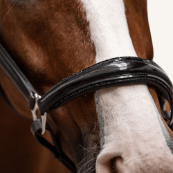 Ein absolutes Must-have! Ob für ein Fotoshooting, fürs Turnier oder einfach nur als edles Highlight in der Pferdegarderobe: Das edle Lederhalfter "Messina" ist nicht nur ein absoluter Hingucker, sondern auch an Komfort nicht zu übertreffen. Für besondere Eleganz sorgt der konisch zulaufende Nasenriemen aus Lackleder mit auffälliger Glitzerbiese. Das Halfter ist dreifach verstellbar, zudem sorgt das weich gepolsterte Genickstück für einen perfekten Sitz.