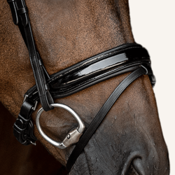 Die Beschläge des Trensenzaums sind aus Edelstahl (silber) gefertigt.
