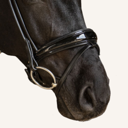 Die Form des schwedisch-kombinierten Nasenriemens ist außergewöhnlich: Mittig sehr breit und nach außen hin schmäler zulaufend wie ein Tropfen - "drop-shaped" genannt. Dies garantiert eine einwandfreie Druckverteilung auf dem empfindlichen Nasenrücken und ist zudem optisch ein absoluter Hingucker. Der breite Nasenriemen (mittig ca. 5 cm) und das größer geschnittene Kieferpad sind besonders weich mit Nappaleder gepolstert. Der Nasenriemen hat eine besonders harmonische Linienführung und sorgt dafür, dass selbst bei aufgenommenen Zügel genügend Platz für die entstehenden Maulfalten bleibt.