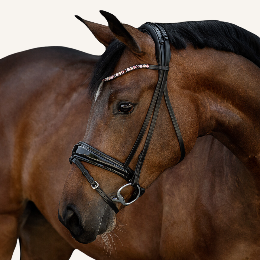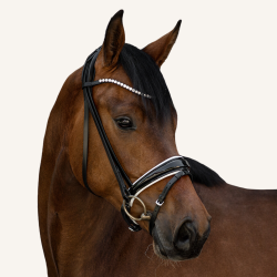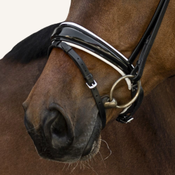 Die Form des schwedisch-kombinierten Nasenriemens ist außergewöhnlich: Mittig sehr breit und nach außen hin schmäler zulaufend wie ein Tropfen - "drop-shaped" genannt. Dies garantiert eine einwandfreie Druckverteilung auf dem empfindlichen Nasenrücken und ist zudem optisch ein absoluter Hingucker. Der breite Nasenriemen (mittig ca. 5 cm) und das größer geschnittene Kieferpad sind besonders weich mit Nappaleder gepolstert. Der Nasenriemen hat eine besonders harmonische Linienführung und sorgt dafür, dass selbst bei aufgenommenen Zügel genügend Platz für die entstehenden Maulfalten bleibt.