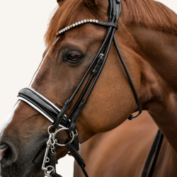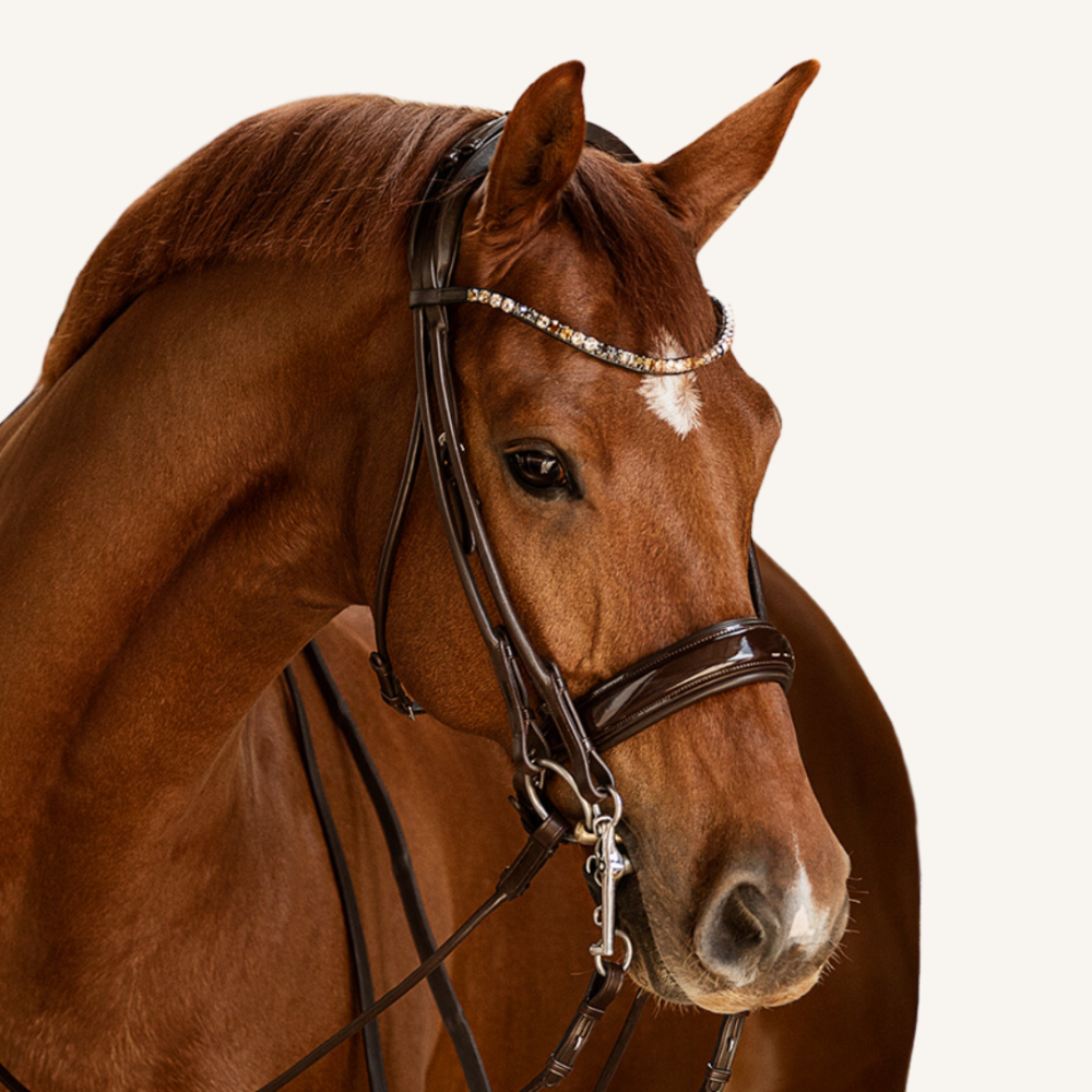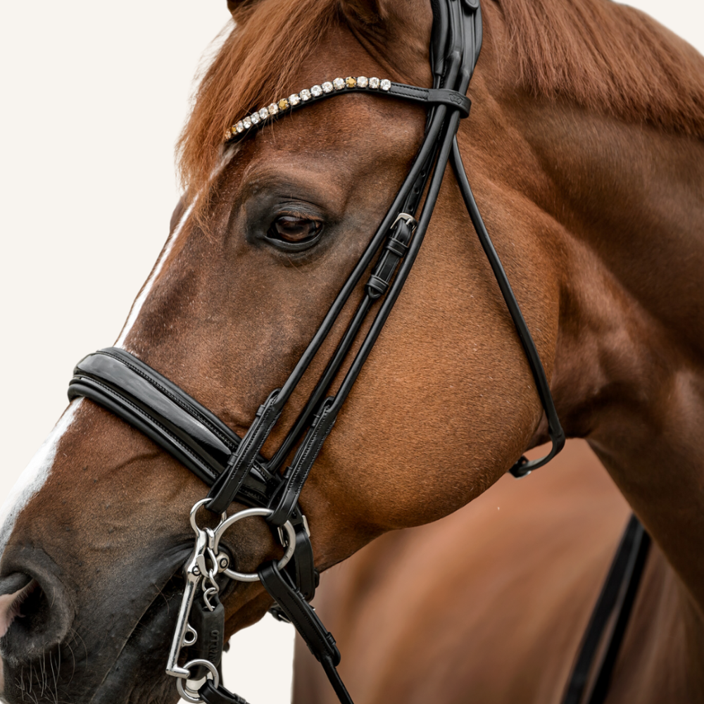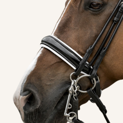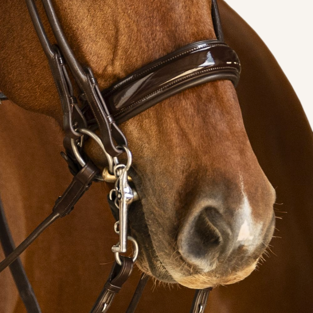 Beim Nasenriemen setzen wir aus Überzeugung weiterhin auf unser typisches, schwedisches Reithalfter. Der breite Nasenriemen (ca. 5 cm) und das größer geschnittene Kieferpad sind besonders weich mit Nappaleder gepolstert. Der Gebissringausschnitt verleiht dem Nasenriemen eine besonders harmonische Linienführung und sorgt dafür, dass selbst bei aufgenommenen Zügel genügend Platz für die entstehenden Maulfalten bleibt.
