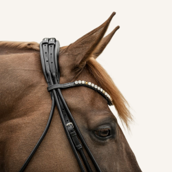Alle Riemen liegen in einer besonders weichen und stark gepolsterten Genickschale. Das Besondere: die Riemen werden mit Zaumhaken verschlossen. Somit konnten wir die Genickschale schmal halten. Die Schale ist auch innen mit Nappaleder überzogen, damit die Riemen nicht verrutschen können.