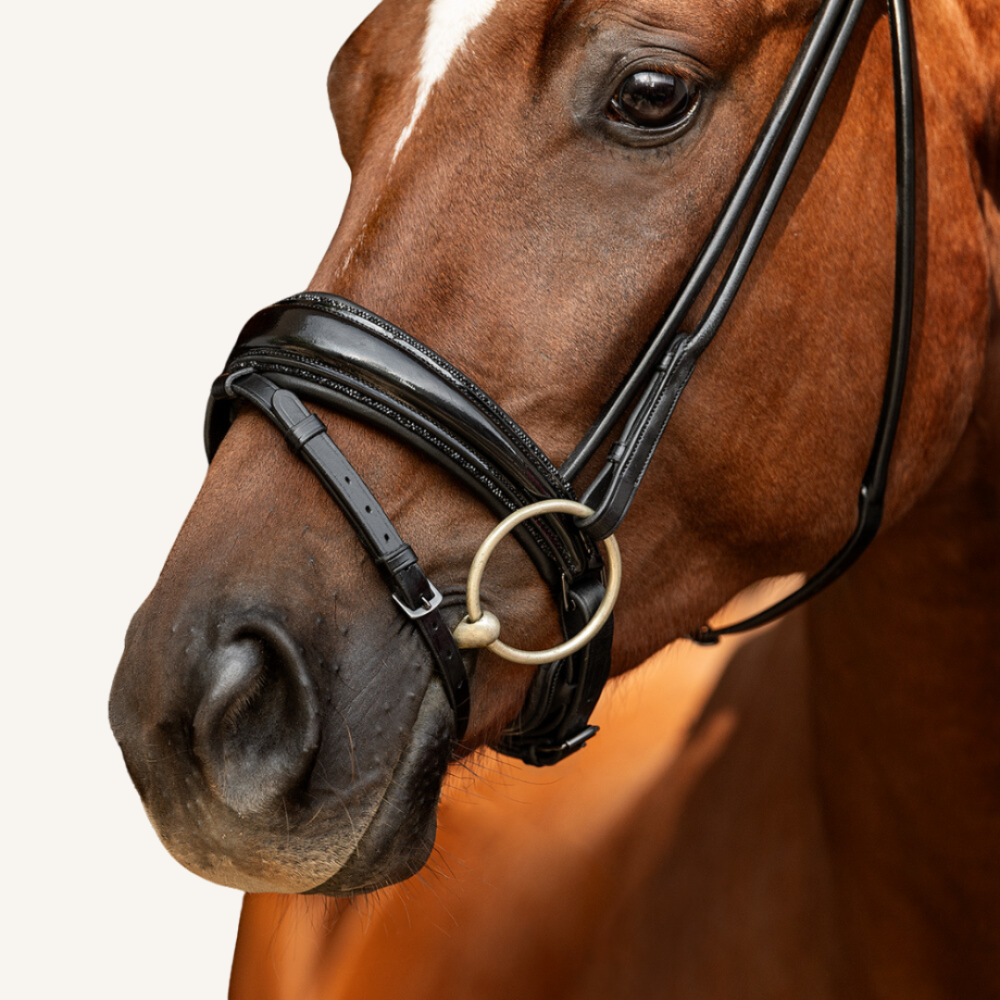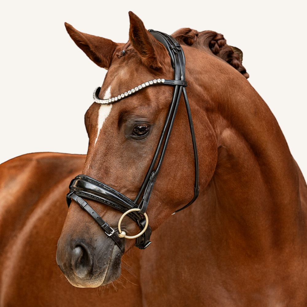 Die Form des schwedisch-kombinierten Nasenriemens ist außergewöhnlich: Mittig sehr breit und nach außen hin schmäler zulaufend wie ein Tropfen - "drop-shaped" genannt. Dies garantiert eine einwandfreie Druckverteilung auf dem empfindlichen Nasenrücken und ist zudem optisch ein absoluter Hingucker. Ein weiteres Highlight am Reithalfter ist eindeutig die schwarze Glitzerbiese am Nasenriemen. Mehr Glamour geht nicht!