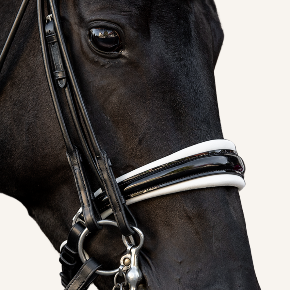 Alle Riemen liegen in einer besonders weichen und stark gepolsterten Genickschale. Das Besondere: die Riemen werden mit Zaumhaken verschlossen. Somit konnten wir die Genickschale schmal halten. Die Schale ist auch innen mit Nappaleder überzogen, damit die Riemen nicht verrutschen können.